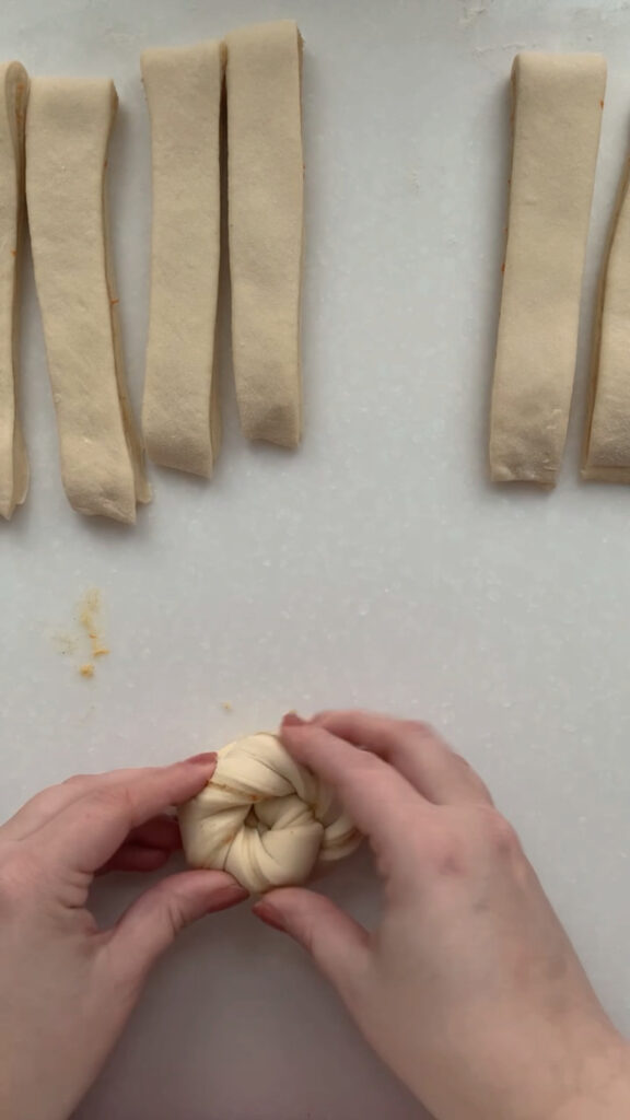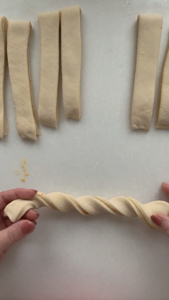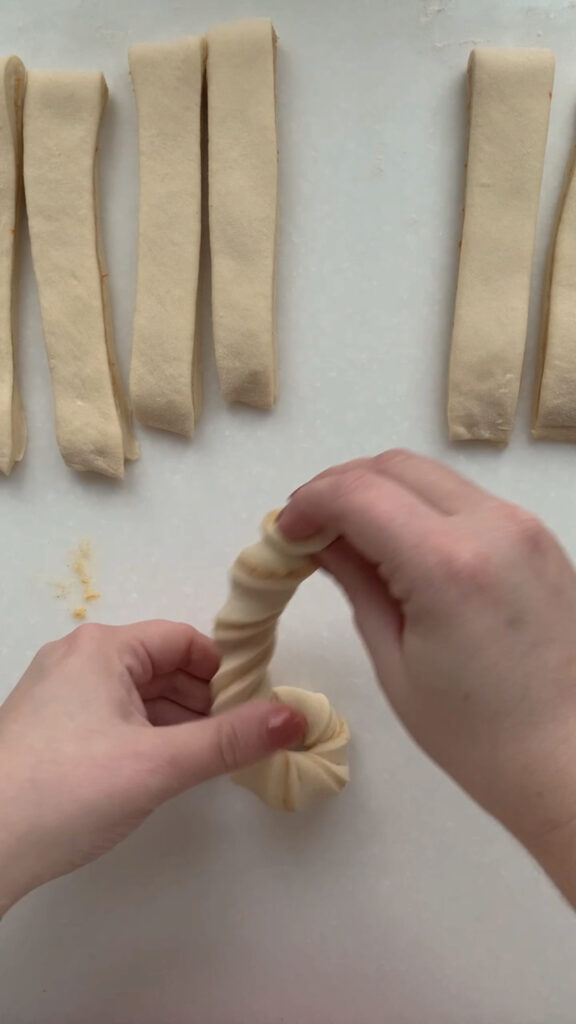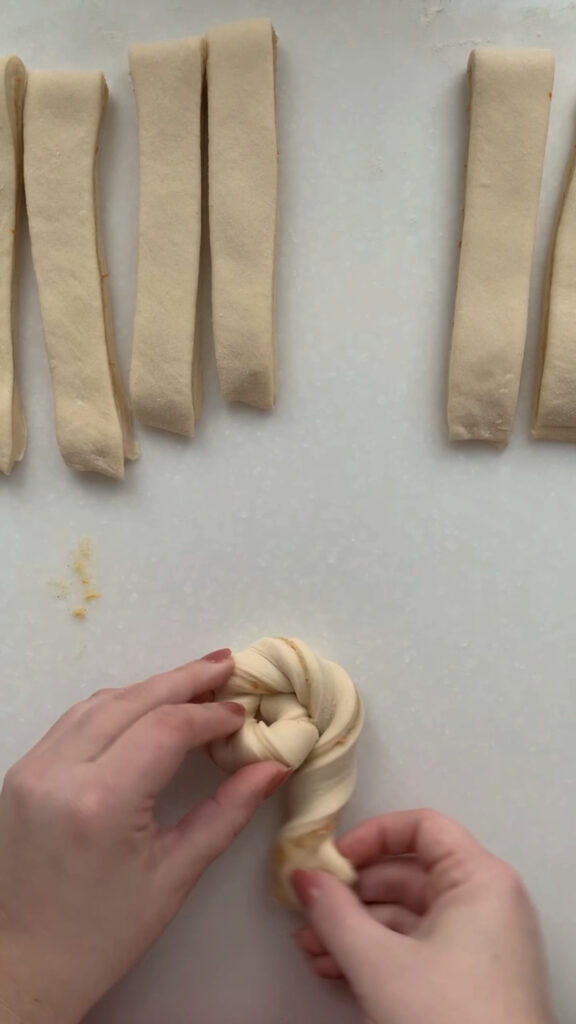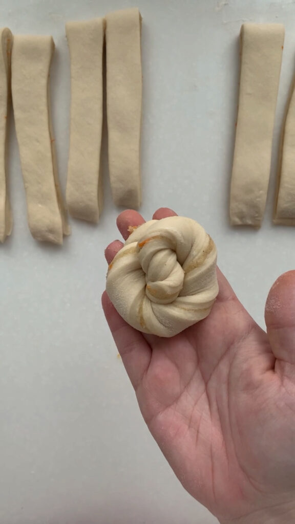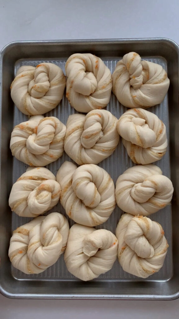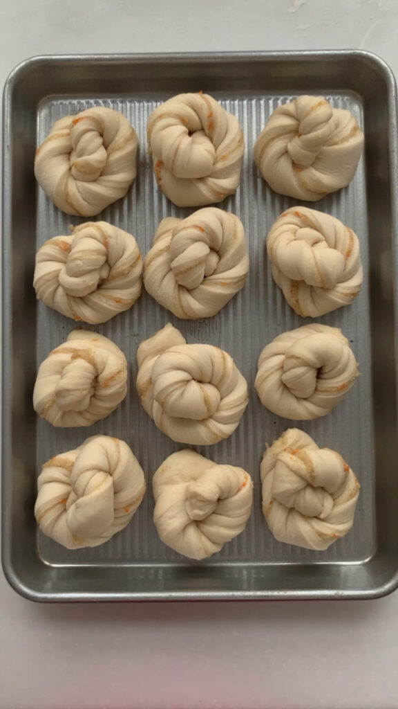 - Next, we are going to divide the dough into 12 equal strips and shape into twists. Use a bench scraper to divide the dough into 4 equal pieces, then cut each piece into 3 strips, for a total of 12 strips. Take one strip and gently pull it to lengthen, then twist the ends in opposite directions. To shape the twist into a roll, take one end and twist it around itself in a circular shape, tucking the last end neatly underneath to secure it. Take your twist and place them equally spaced on your sheet pan. Cover with plastic wrap and let rise in a warm spot for 1-3 hours, until they’re soft, puffy, and airy to the touch.