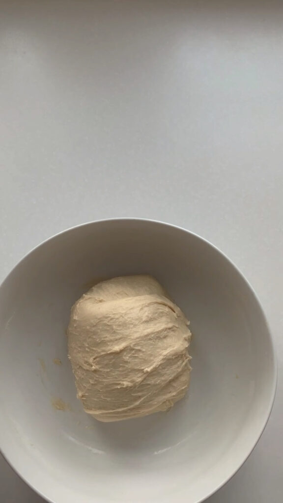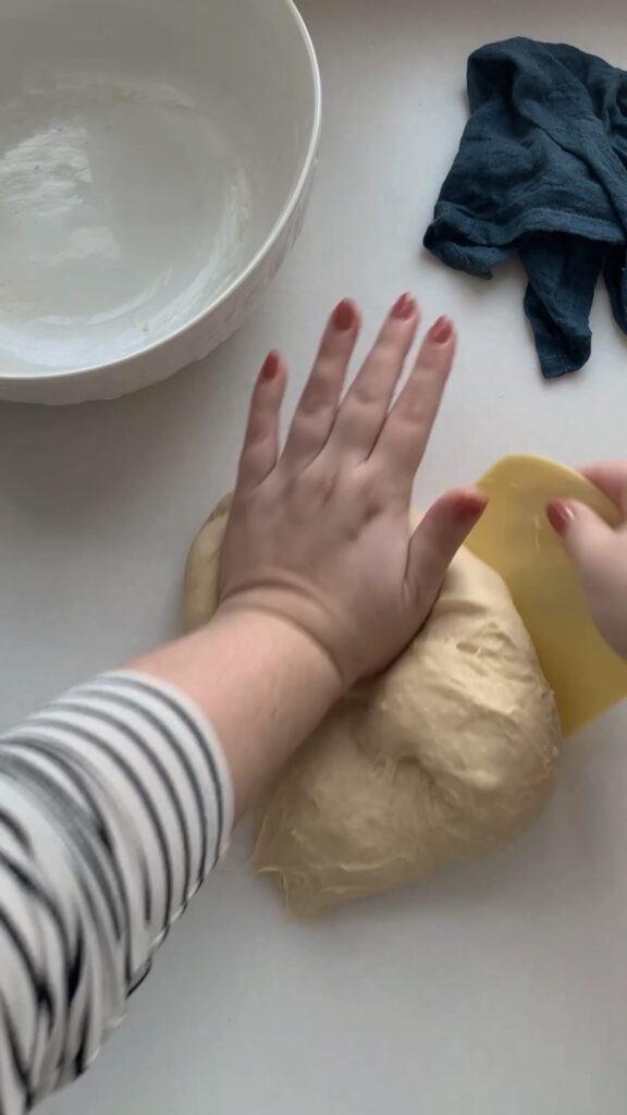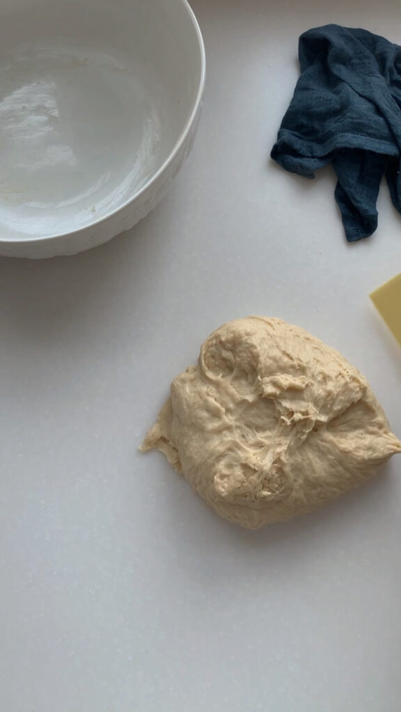 Now that the dough has rested for 30 minutes it is time to knead it. Using your bowl scraper, grab your dough from the bowl and place on your countertop. Stretch the dough away from you with the heel of your hand, then fold it back over itself and repeat. If kneading is new to you, see my post on brown butter bagels for a visual on kneading to help guide you. Continue kneading for 8-10 minutes. It may be a bit messy at first but the dough will come together nicely. Aim for a smooth, elastic texture that is slightly tacky but not sticky. Use your bench scraper as needed to clean the counter and help keep the dough manageable. Place the dough back into the bowl and cover with plastic wrap, rest for 30 minutes.