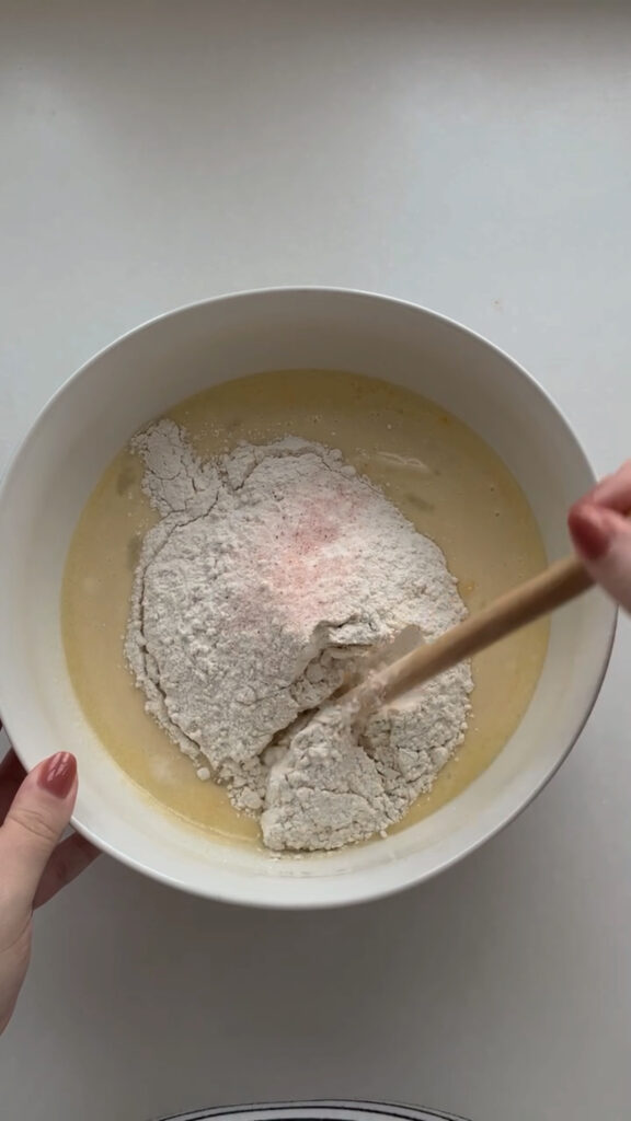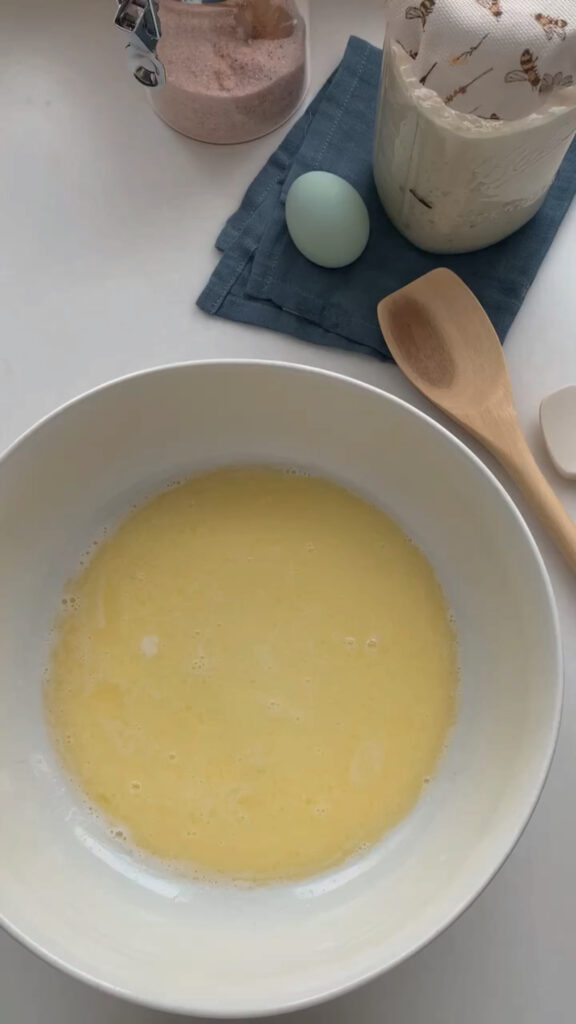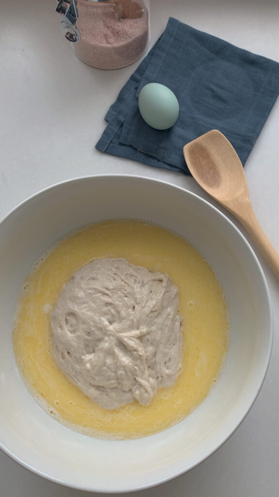 - Heat the milk and butter in a small pot until just melted, then pour into a mixing bowl and let cool for 10–15 minutes. Stir in the sourdough starter, then add the egg, sugar, flour, and salt, mixing until fully combined with no dry bits remaining. Scrape down the sides of the bowl, cover, and let rest for 30 minutes.