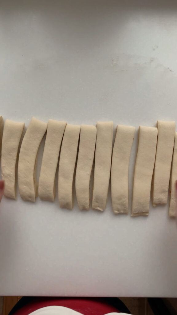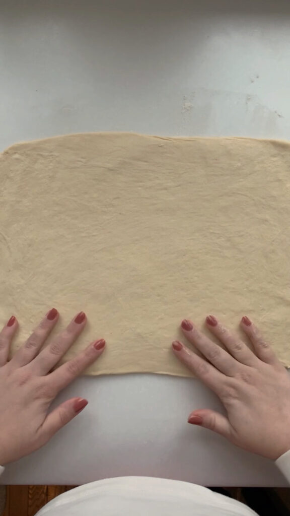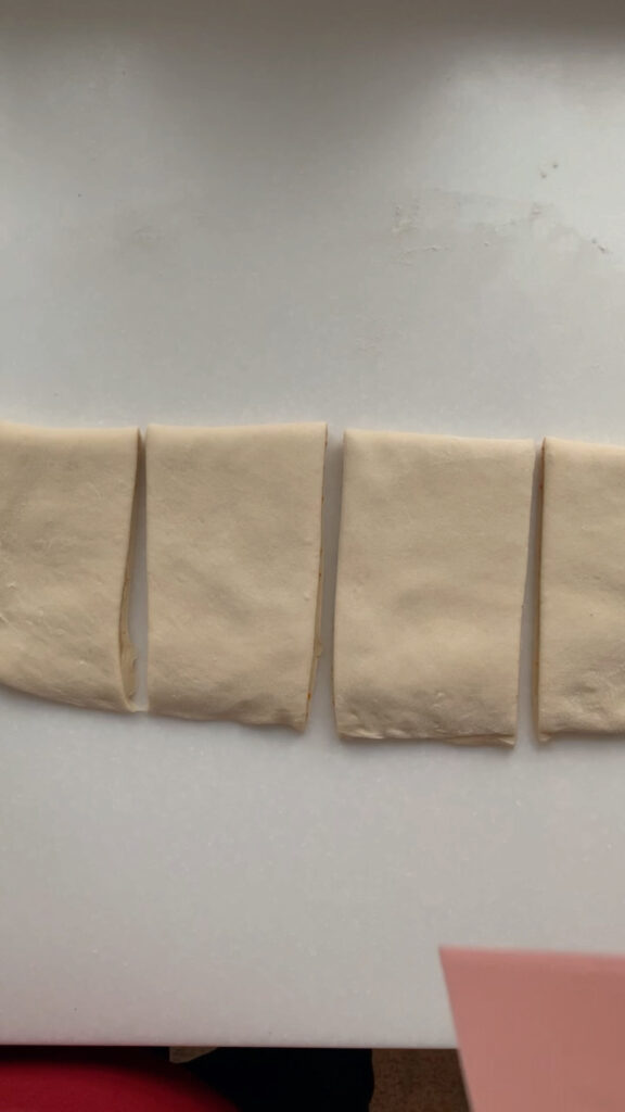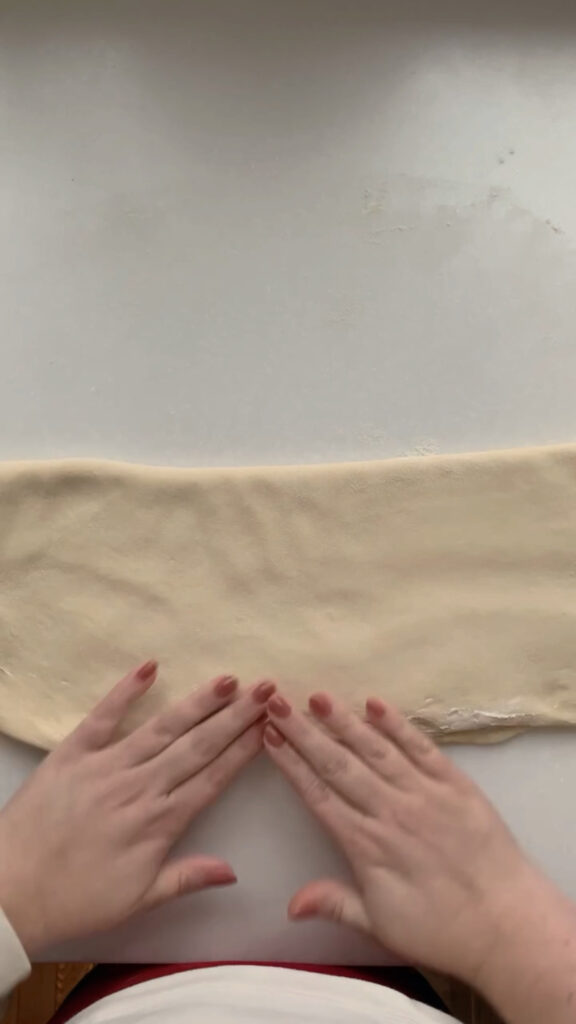 Once the dough has doubled in size, jiggles when shaken, and has visible bubbles on the surface, it’s time to mix up your filling and shape the dough into twists. First, combine your sugar, softened butter, orange zest, vanilla bean paste and flour in a small bowl and set aside. Next, use your bench scraper to loosen dough from the bowl edges then turn the dough out onto a floured counter. Flour the top of your dough, grab your rolling pin and roll the dough out into a rectangle. Use flour as needed to prevent sticking to your counter. Take your filling and spread on the bottom half of your rectangle only and then fold the top dough over, seal the edges by pressing them together.