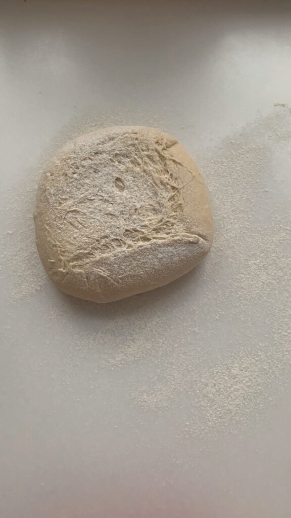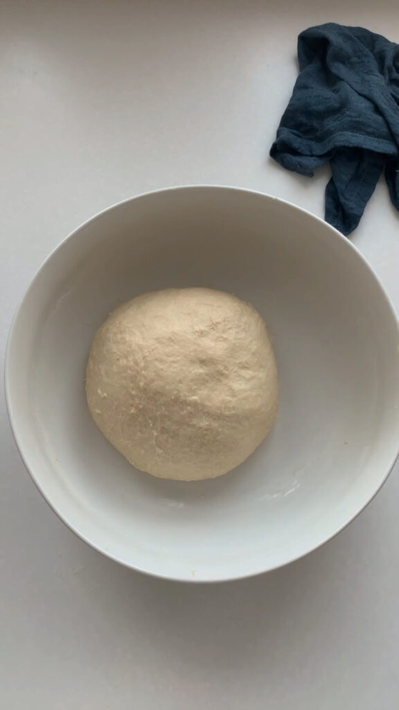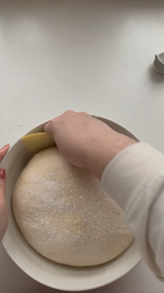 Perform 1-2 sets of stretch and folds, spaced 30 minutes to 1 hour apart. This step is flexible, fit it in whenever you have a free moment. To do a stretch and fold, gently stretch one side of the dough upward and fold it over itself, then rotate the bowl and repeat on all 4 sides. Once you’ve completed your sets, cover the bowl with plastic wrap and let the dough bulk ferment at room temperature for 8-12 hours. I usually time mine to bulk ferment overnight so it’s ready to shape first thing the next morning.
