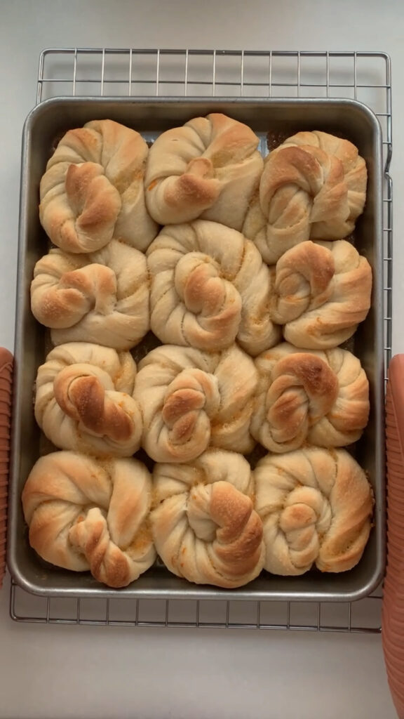 Take your twist and place them equally spaced on your sheet pan. Cover with plastic wrap and let rise in a warm spot for 1-3 hours, until they’re soft, puffy, and airy to the touch.