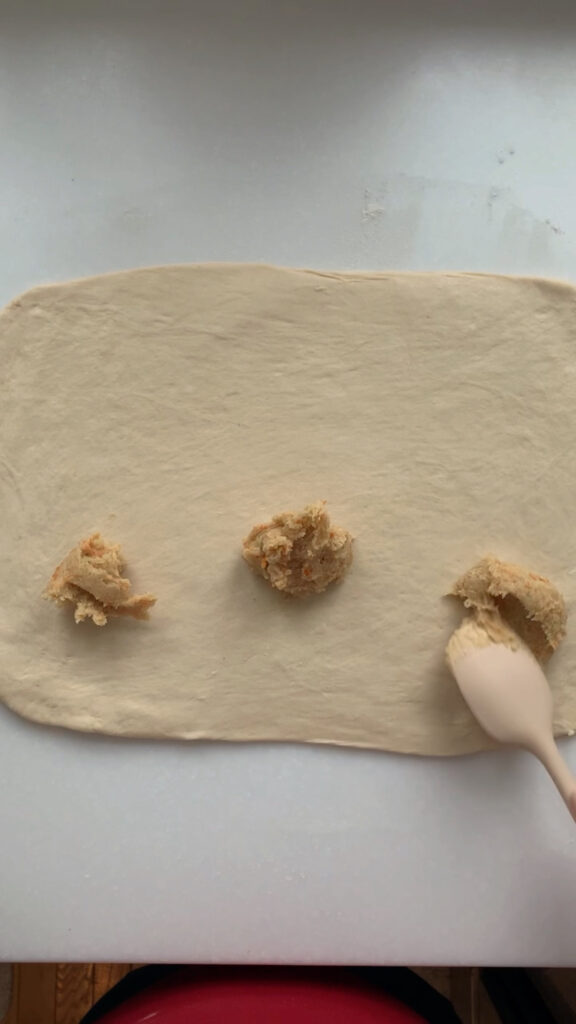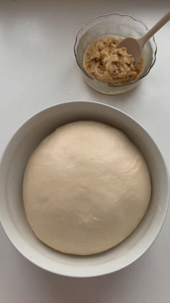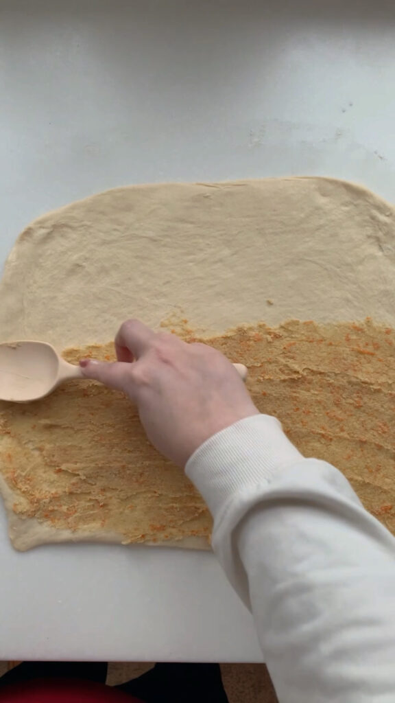 - Once the dough has doubled, looks bubbly, and jiggles slightly, prepare the filling by mixing sugar, softened butter, orange zest, vanilla bean paste, and flour. Turn the dough onto a floured surface, roll into a rectangle and spread the filling over the bottom half. Fold the top half over and press the edges to seal.