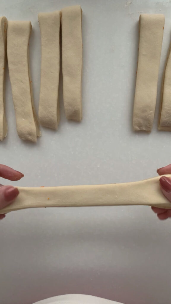 Next, we are going to divide the dough into 12 equal strips and shape them into twists. Take your bench scraper and divide the dough into 4 equal parts. Then, take each of these 4 portions and divide them into 3 equal strips, for a total of 12 strips. To shape a twist, grab one strip and gently pull it to lengthen. Hold each end and twist them in opposite directions. Take one end of the now-twisted strip and wrap it around itself in a circular shape. When you reach the last bit of dough, tuck it under the roll.