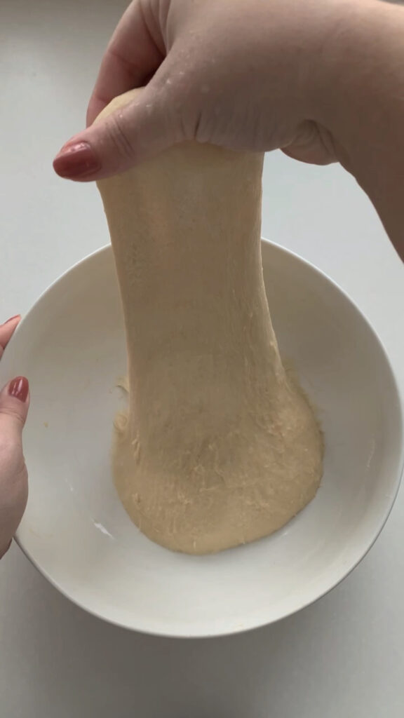 - After the 30-minute rest, transfer the dough to your countertop and knead by stretching it away with the heel of your hand, then folding it back over itself. Continue for 8-10 minutes until the dough becomes smooth, elastic, and slightly tacky but not sticky, using a bench scraper as needed to manage it. Return the dough to the bowl, cover, and let rest for another 30 minutes.